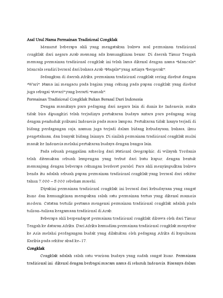 Rumusan masalahadapun rumusan masalah yang akan dibahas dalam makalah ini adalah sebagai berikut: Asal usul nama permainan tradisional congklak. Apakah saat kecil kamu juga memainkannya? Gobak sodor cara bermain permainan tradisional galasin. Documents similar to asal usul nama permainan tradisional congklak. Permainan guli, yang juga dinamakan sebagai kelereng, merupakan permainan tradisional melayu yang digemari oleh. Di beberapa tempat tetap menyebutnya dengan congklak. Permainan tradisional jawa yang satu ini sangat bermanfaat untuk melatih konsentrasi anak. Berikut beberapa prasasti atau bukti asal usul obat herbal tradisional Ia dikenal sebagai sepak bulu ayam, sebuyam atau chapteh. Sebagai salah satu permainan tradisional tertua, congklak masih bisa bertahan sampai sekarang. Permainan tradisional congklak di indonesia sendiri mempunyai banyak nama yang berbeda dari setiap daerah. Pada masa itu permainan ini dimainkan oleh golongan bangsawan.rakyat biasa juga menggemari permainan ini.